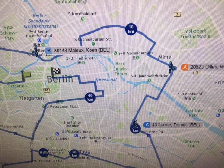 Het was nog even wachten op de mannen. Je zou denken dat dat wachten lang duurt, maar voor ons supporters vliegt de tijd echt voorbij. Je bent de hele tijd bezig met tracken, communiceren met het thuisfront , maar ook kijken naar de lopers. Veel nationaliteiten, mensen die verkleed zijn (zelfs als Brandenburger Tor), zelfs mensen op blote voeten. Je kan het zo gek niet bedenken.