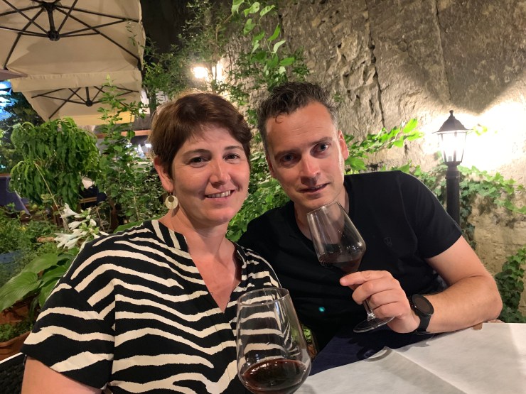 Tijd om naar het meer te gaan was er niet meer, helaas. Dat zal voor een andere dag zijn. We reden terug richting Spoleto op ons klaar te maken. Ter gelegenheid van Ferrogosto had Willem gereserveerd in één van de betere restaurantjes van Spoleto. Iets om je op te verheugen, ware het niet dat ik in Spoleto nog een afslag van een rond punt mis… en opeens midden in de kleine straatjes terechtkom, stijl: het is hier max. 2m20 breed en er staat ook nog een Fiat geparkeerd😱. Waar ik daarstraks nog de held was, werd ik plots de pineut! Gelukkig heeft Willem hierin al enige ervaring en heeft hij het stuur overgenomen. Met een rits claxonnerende auto’s achter ons uiteraard.