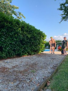 Ondertussen lopen de temperaturen hier ook op tot een 32 graden. Op het gevaar af op de brandstapel te komen hiervoor (want we gaan nu toch niet klagen), is dat toch al een tik te warm voor mij. Tenzij je natuurlijk het grootste deel van de dag pendelt tussen zwembad en ligstoel onder de appelboom, hetgeen we ook effectief deden.