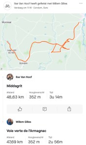 Om 11 uur stond de verhuurder van de fietsen ons keurig op te wachten met 4 Trek-fietsen. Hijzelf was een Welshman van origine, een zeer aimabele man. En wij weg voor een tochtje van een paar uur. Eerste sortie was richting Cassaigne, dat hadden we nog niet bezocht. Eens je de spoorweg verlaat is het dadelijk wel stevig klimmen, in totaal hebben we vandaag 352 hoogtemeters gedaan. Helemaal mijn ding niet. Als er iets is waar ik een hekel aan heb, is’t bergop rijden. Ik kan niet doseren, rij niet graag als een slak omhoog. Dus bijgevolg rijd ik steevast te snel om goed te zijn en ben ik al gaar om terug naar huis te keren op de eerste bergtop. Maar enfin, we zijn er geraakt.