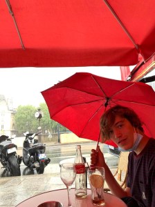 Nochtans zag het er ‘s ochtends niet te best uit. Tot 10 uur wel, geen druppel en zalig (niet te warm) weer had ik gemerkt toen ik verse croissants om de hoek ging halen. Maar toen we onze neus buitenstaken om op tocht te vertrekken begon het te drashen. Vlug vlug wat paraplu’s kopen, want die hadden we niet bij. Het plan was om dan te beginnen met het Louvre. Vooral Lasse wou daar graag naar toe. Voor Mare maakte het niet uit en wij waren meer pro Musée d’Orsay, hoewel we dat allebei al gezien hadden. We vreesden ook dat het Louvre ons een hele dag zou nemen. Daarom spraken we af dat we er een aantal zaken zouden uitpikken en het daarbij houden.