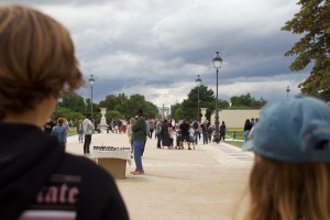 Ik weet niet precies hoe lang we hebben rondgelopen, maar onze voeten begonnen redelijk pijn te doen en onze maag te knorren. Tijd om wat frisse lucht te happen en onze magen te vullen. We kwamen boven aan de kant van Jardin de Tuilerie, waar er veel Parisiens aan het genieten waren. Je zag in de verte 1 stroom mensen komende van (of gaande naar) Champs-Elysées en Arc de Triomphe.