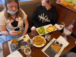 Nadien hebben we al een klein hongertje, dus springen we op weg naar Marais binnen in een café waar de tijd is blijven stil staan. Ne croque monsieur voor de Lasse, chicken dips voor Mare, meer moet het niet zijn. Ondertussen blijft het de hele tijd regenen.