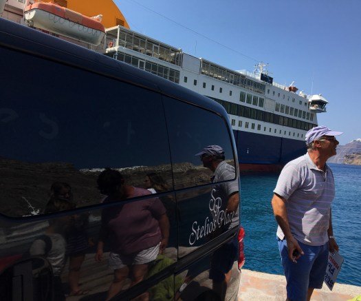 En dan moesten we ons even reppen om de bus naar Fira te nemen. Je kan maar 2x per dag een boottocht doen naar de vulkaan, althans tegen normale prijzen.